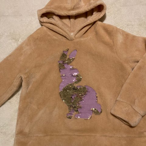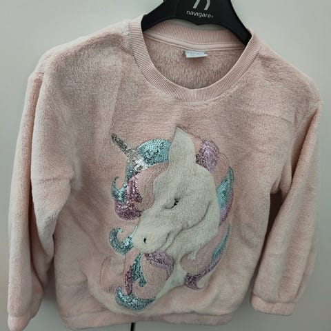 H&M hettegenser for barn i størrelse 128, farge beige. Genseren har mykt materiale med en lomme foran dekorert med et enhjørningmotiv, inkludert broderte øyne, ører og horn. Passer for jenter.