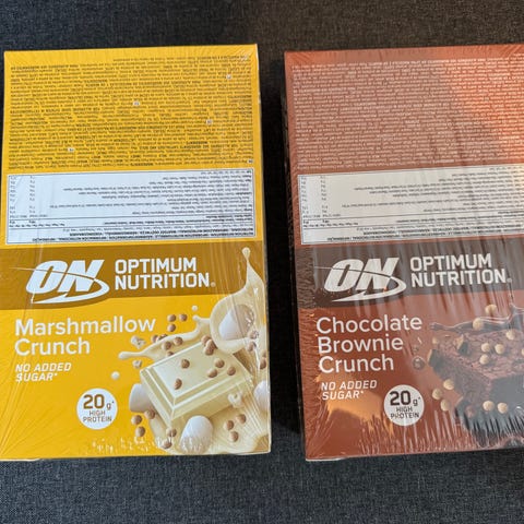 7 proteinbarer og 1 maxim energibar. Proteinbarer hadde best før dato 04.09.25, men er nok ikke farlig å spise nå heller