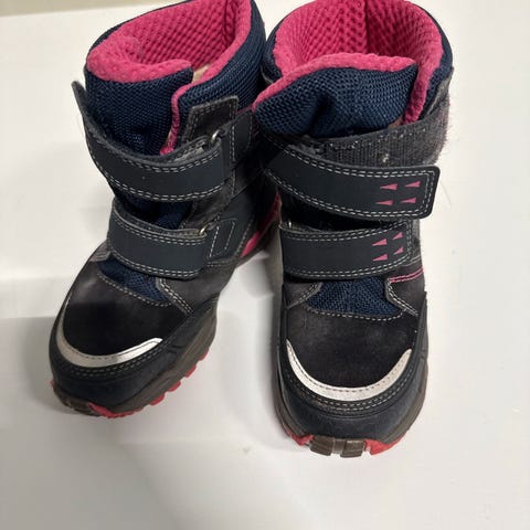 Viking Barn Vinterstøvler i størrelse 29, designet for jenter. Støvlene har en kombinasjon av svart, rosa og hvit farge, med solide såler for godt grep. Materialet inkluderer tekstil og syntetiske komponenter, med en varmende fôr for kalde værforhold. Egnet for utendørs bruk i vinterhalvåret.