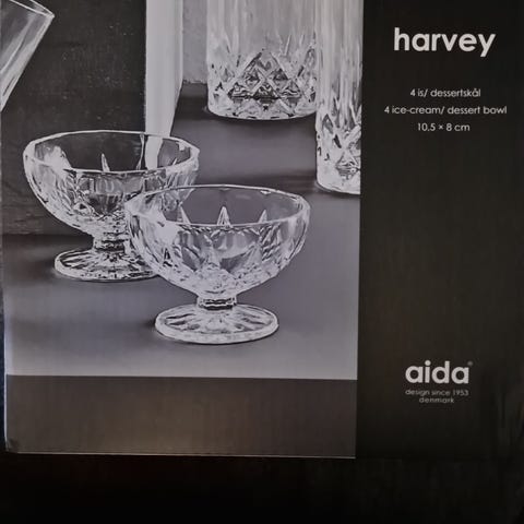 Aida Harvey dessertskål, 4 stk, hver med dimensjoner 10,5 x 8 cm. Skålene er laget i klart glass med dekorativt mønster, egnet for servering av iskrem eller desserter.