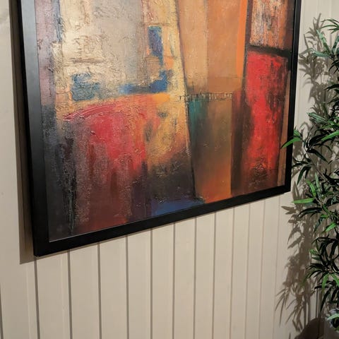 Abstrakt maleri med varme farger som gull, bronse, sølv og svart. Maleriet har en teksturert overflate og uregelmessige former og linjer som skaper et dynamisk uttrykk. Jeg har malt selv, men likte ikke. Kanskje noen andre liker?