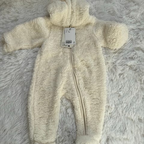 H&M baby sparkebukse i størrelse 62 med søte ører, unisex. Dressen er grå og har hette med fôret innside i mykt materiale for varme og komfort. Selges da den allerede var for liten når vi fikk den i hus.