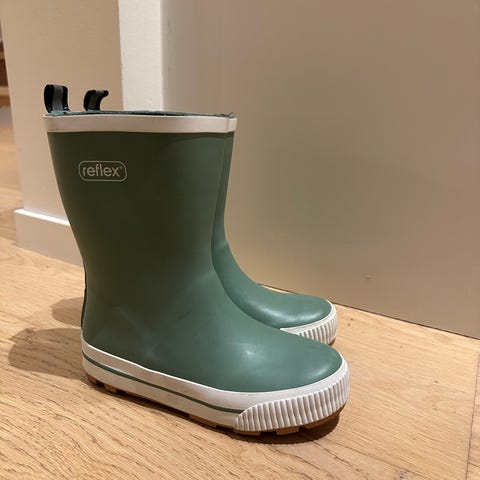 Reflex støvler i størrelse 33, unisex modell. Gummistøvler i grønn farge, egnet for barn. Laget av vanntett materiale for bruk i vått vær.