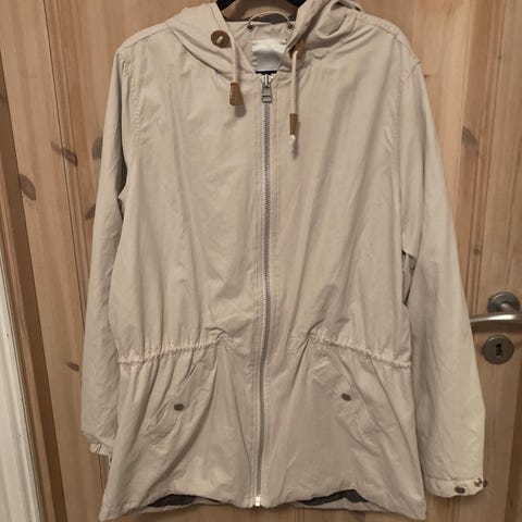 Soyaconcept regntøy jakke i størrelse XL for kvinner. Jakken er hvit og har hette med snøring og treknapper. Den har glidelås foran, elastisk midje og lommer med knappelukking. Jakken er egnet for utendørs bruk i vått vær.