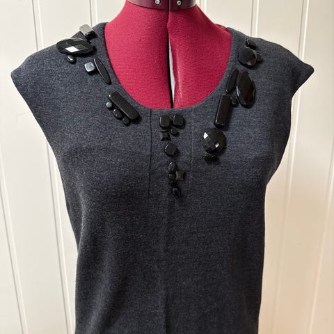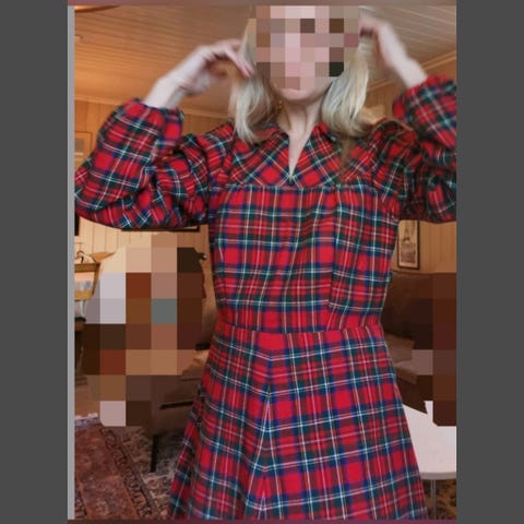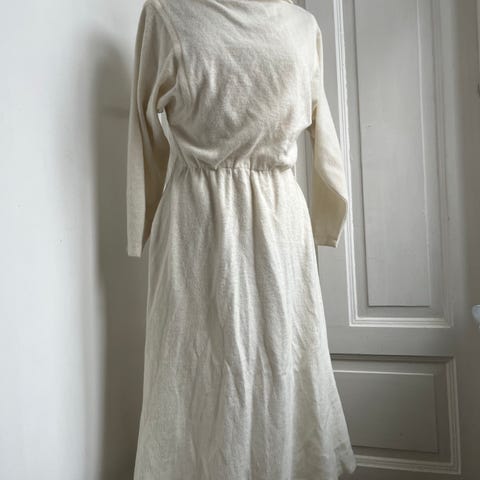 Vakker vintage kjole i lys lilla brodert med perler i str 46/L. Kjolen er handsydd, har innsnitt og glidelas bak på ryggen.