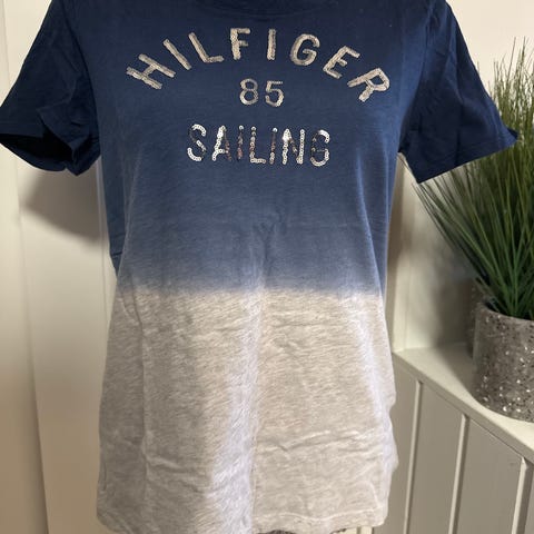 Tommy Hilfiger T-skjorte i blå farge, størrelse S, designet for kvinner.
