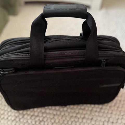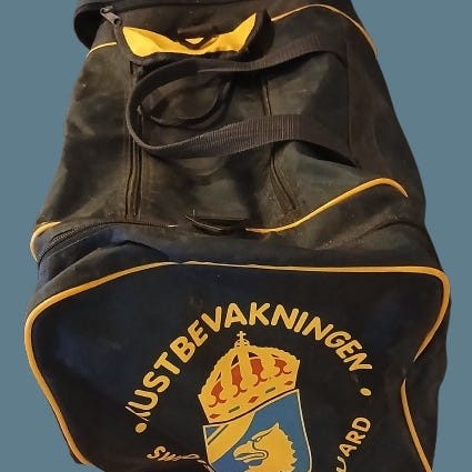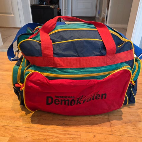 En vintage reklameartikkel, for Brunstad Møbler, i form av en bag. Stammer antageligvis fra 80-tallet. Har to ytre lommer. Noen bruksmerker, men fullt brukbar.