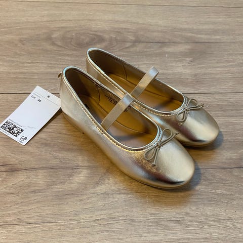 H&M barn sko i størrelse 27, designet for jenter. Skoene er røde med glitrende overflate og har en stor sløyfe i fløyel på toppen. Materialet gir et dekorativt og festlig utseende. Skoene har en flat såle og passer til barn.