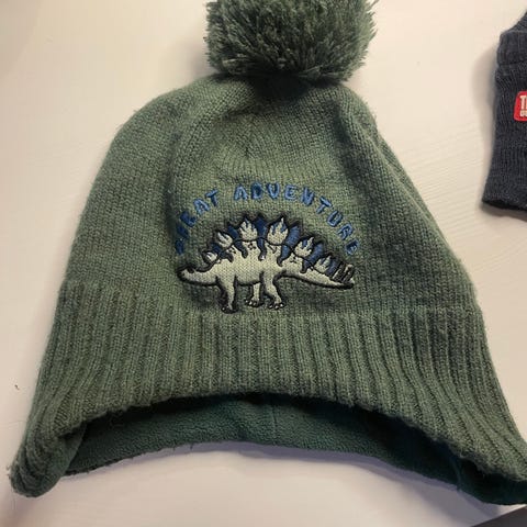 Lue i ull med mønster av mennesker. En liten knapp i metall på toppen. Mulig denne passer best til barn mtp størrelsen, altså litt liten til en voksen.