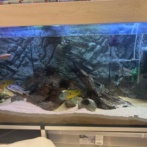 Pga plassmangel i ny bolig selges stort og fint akvarie (325liter). I prisen medfølger en Fx5 pumpe, (kraftig pumpe som kan drive større akvarier enn dette), varmekolbe, luftpumpe, har noen plastplanter av ulike slag som også kan medfølge, samt sand/stein (hvis ønskelig). Dekorative gjenstander som antikk krukke, hvor mindre fisk kan gjemme seg, stor dekorativ hodeskalle av elefant for litt større fisk medfølger også, samt div annet utstyr som håv (en stor og en liten), dreneringslange, algeskrape med langt håndtak, automatisk foringsmaskin for ferieperioder mm.
