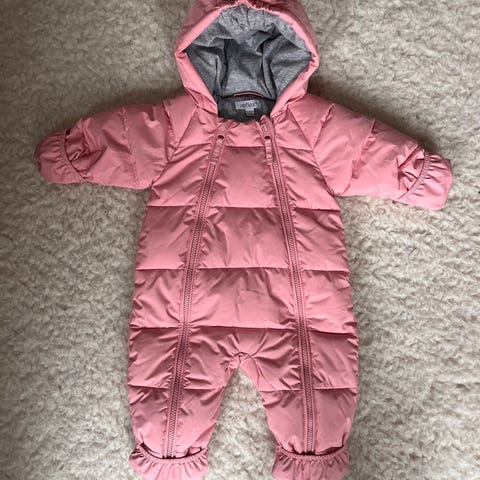 Dressen har myk utside i børstet polyester twill og fôr i bomullsjersey, som gir en behagelig følelse mot huden. Innvendig padding i fløyelsmyk, dunlignende resirkulert polyester gir varme uten å bli klam. Den smarte løsningen med «fold-over» på ermer og føtter gjør det enkelt å lukke dressen rundt små hender og føtter – perfekt når man vil unngå votter eller sko.