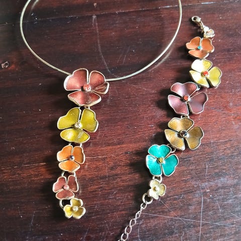 Pilgrim Blomster halskjede og armbånd for dame, laget av andre materialer. Emaljert. Smykkesettet består av flerfargede blomsterdetaljer, med et halskjede og et matchende armbånd.