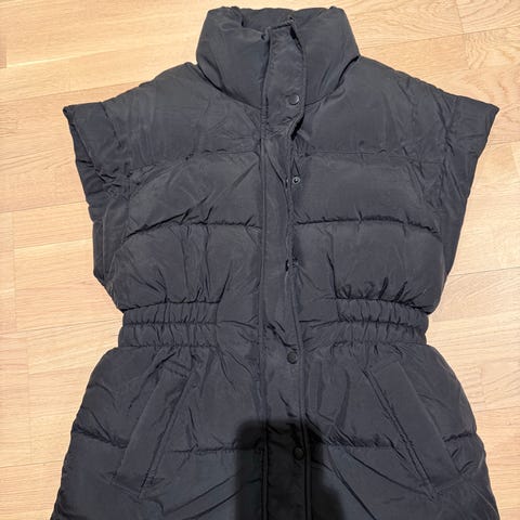 Boblevest med avtagbar hette selges. Dette er en sample size fra merket The Edit, derfor er det noe usikkert på eksakt størrelse. Jeg er en strl Small og den er for stor for meg. Derfor aldri brukt. Lommer i siden. Lys kaki grønn.