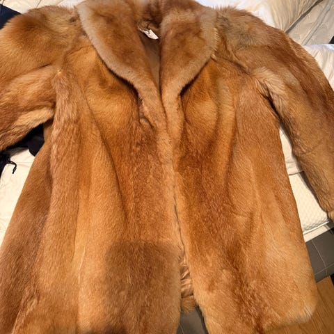 Jakken har ingen lapp eller merke som bekrefter type pels eller produsent.