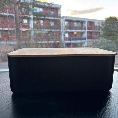 Selger en praktisk og stilren Bodum oppbevaringsboks. Denne modellen har et solid bambuslokk som også fungerer som skjærebrett, og en romslig boks i hardfør plast. Perfekt til brød, bakevarer eller generelt kjøkkenoppbevaring.