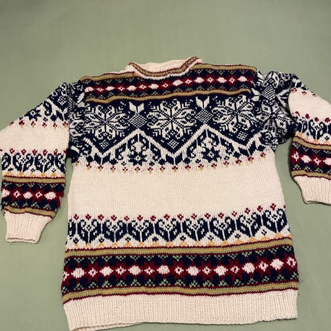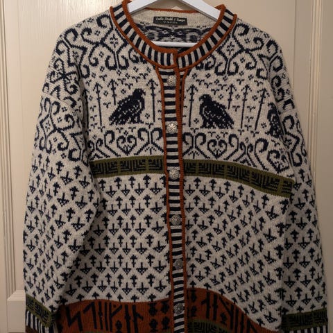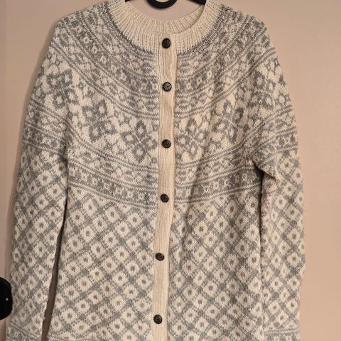 Hjemmestrikket kofte, Kvalavågskofte etter oppskrift og design fra Klompelompe. Nydelig mørk og lys blå, strikket i tynn Merinoull, Sandnesgarn. Utrolig myk og behagelig, klør ikke, kan vaskes i maskin på ullprogram. (Er nyvasket)
