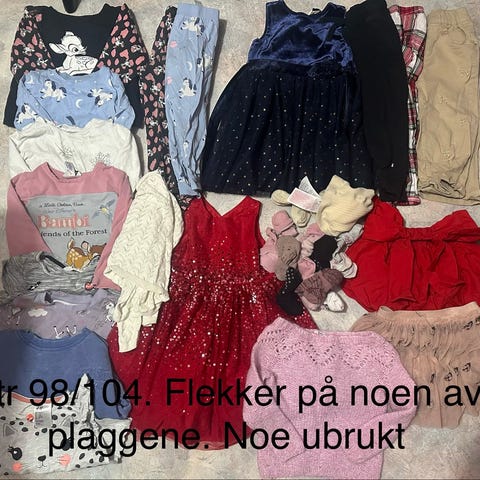 Selger en pakke med hjemmesydde klær i størrelse 98/104. Inneholder en ullgenser, en kjolegenser, tre kjoler, en bukse, en pysjgenser, en pysjbukse, to T-skjorter, 1 singlet og en vest-genser (strikket).