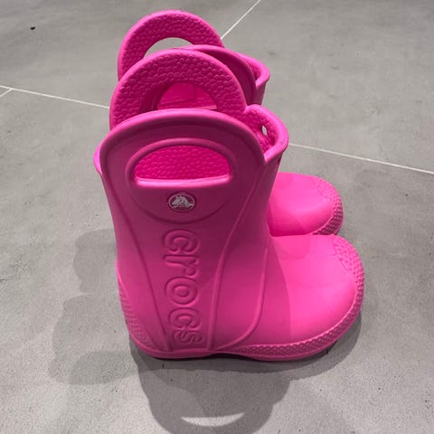 Crocs barn gummistøvler i rosa farge, designet for jenter. Støvlene har en slitesterk gummisåle med godt grep og er laget av lett materiale som gir god komfort og beskyttelse mot vått vær.