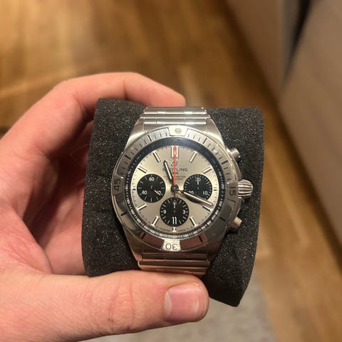 Selger en pent og lite brukt Breitling Navitimer B01 Chronograph 43. Klokken er kjøpt ny våren 2025 og kun brukt ved et par anledninger. Den fremstår som tilnærmet ubrukt, uten synlige merker eller riper.