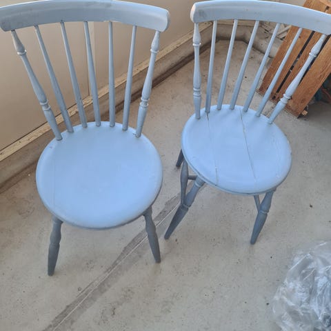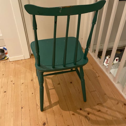 Denne stolen er en eldre modell, men benene og rygg- spilene sitter godt fast. Jeg har lagt en svart filt over for å sitte bedre. Denne kan tas av, men da må stolen pusses og males på nytt.
