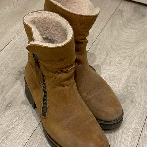Ytterdelen har både semsket skinn, vatteringsfelt og pels i overkant. Disse har en varm membran inni skoen, mener å huske at det er ull. Med disse holder du føttene godt og varme!