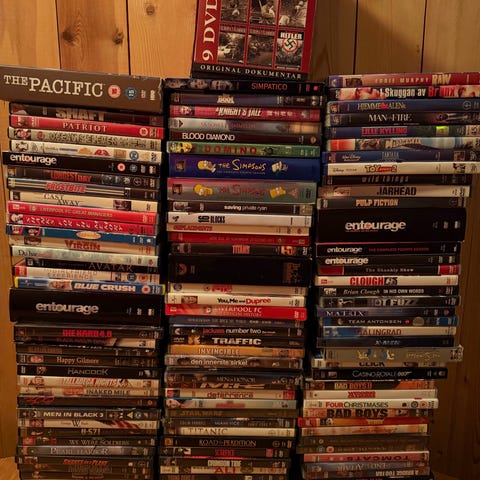 Samling av DVD-filmer for barn og familier, inkludert titler som Disney's 'Den Lille Havfruen', 'Disney Prinsesser', 'Happy Feet', 'Ratatouille', 'Shrek', 'Willy Fog på reise til Jordens indre', og flere.