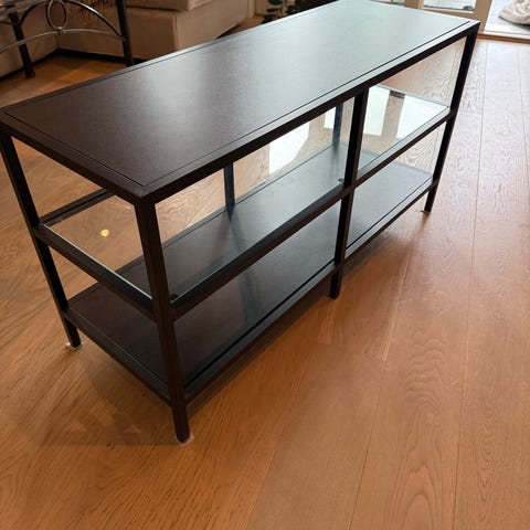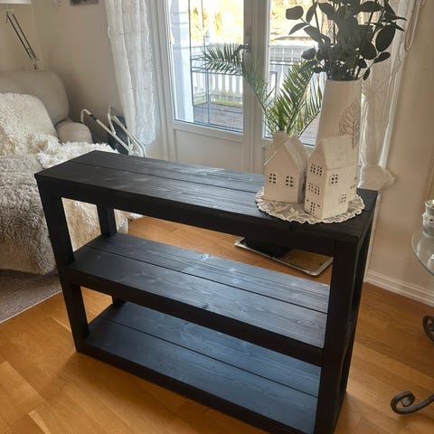 Sort trehylle med tre nivåer og dekorative, dreide ben. Hyllen er laget av tre og har en klassisk design. Passer til oppbevaring eller dekorasjon i hjemmet.
