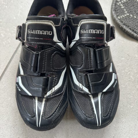 Shimano WM51 sykkelsko for damer i størrelse 38. Skoene har hvit og svart fargekombinasjon, tre borrelåsstropper for justering, og gummisåle med klikkpedalfeste. Egnet for sykling med god passform og støtte.