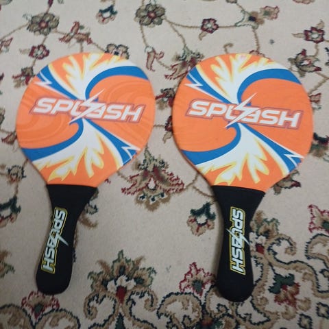 Let's Play strandtennissett som inkluderer to racketer og en ball. Racketene har gul og svart farge med håndtak i flere farger. Egnet for utendørs bruk, spesielt på stranden eller i hagen.aldri brukt kan sendes mot at kjøper betaler frakt