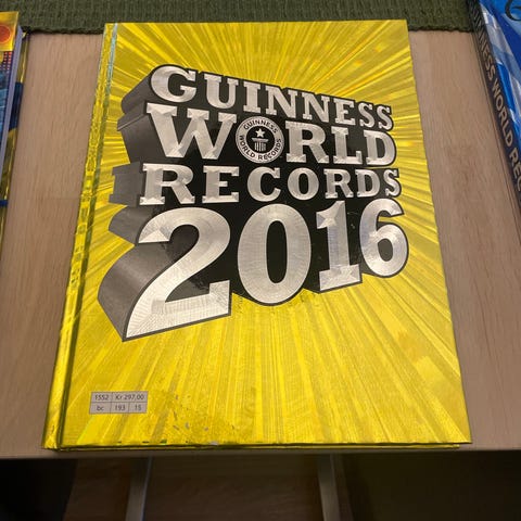 Guinness World Records 2016 bok med informasjon om forskjellige rekorder og prestasjoner. Boken har et gult omslag med 3D-effekt på forsiden. Den inneholder oppdaterte verdensrekorder per 2016 og er egnet for lesere som er interessert i fakta og rekorder.