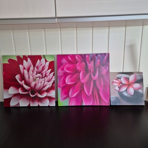 Billedserie med tulipaner, rose og anemoner. Mål store bilder 60x60, lite bilde 19x60. Selges samlet for kr 600, enkeltvis kr 250 for store og kr 100 for det lille. Se nypris store!
