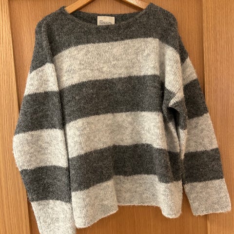 Selger en supermyk og varm ullgenser fra det danske merket Fine i klassisk svart med brede beige striper. Genseren har en fluffy/”børstet” look og litt løs passform med vide ermer.