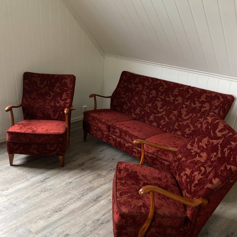 Spenstig og elegant lenestol frå midten av forrige århundre. Originalt stoff. Fint brukt, kun litt slitasje på forkant av setet. Det eine bakbeinet hadde vore knekt av ein gong i tida, men det har eg no reparert fagmessig. Elles ingenting å bemerke.