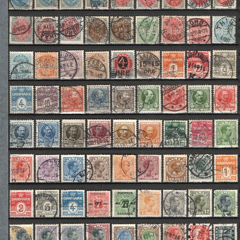 202 forskjellige danske frimerker mellom AFA 1 og 272. Hovedsakelig stemplede merker. Se innholdsoversikt som medfølger. Ved tvil om type/ikke sjekket, er billigste type valgt ved verdsettingen (se f.eks. AFA 36B/C). Samlet AFA-verdi er regnet til kr 5 136. Pris er inklusive porto. Merkene pakkes i pose ved sending.