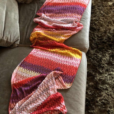 Klassisk chevron/zig zag mønstret skjerf i nydelige pastellfarger fra italienske Missoni. Mykt og deilig i ull/mohair. Langt og kan styles på ulike måter, svært pent brukt.