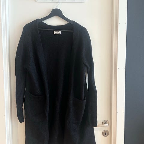 Fin strikket cardigan i svart fra Acne. Oversized style og vil passe en small/medium. Trykknapper og lommer. Pent brukt.