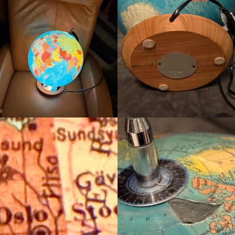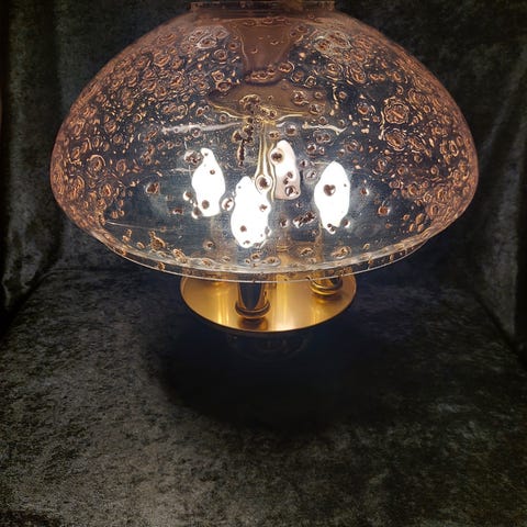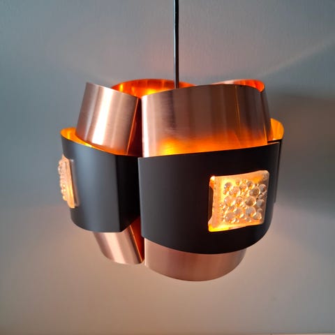 Mid century modern design lampe fra 1960-tallet. Design: Erik Höglund. Produsent: Boda glasverk nå kjent som Kosta Boda. Emaljert Metal og støpt glass. Tre forskjellige farger på de 6 glassene: gul, lilla og blågrønn. Glassene kan enkelt tas ut og flyttes på. Lang kraftig kjetting som den henges opp med. Vekt 5-7kg. Høyde: 21,8cm Bredde: 26,5cm fra hjørne til hjørne. Bredde: 24,5 fra flatside glass til flatside glass.