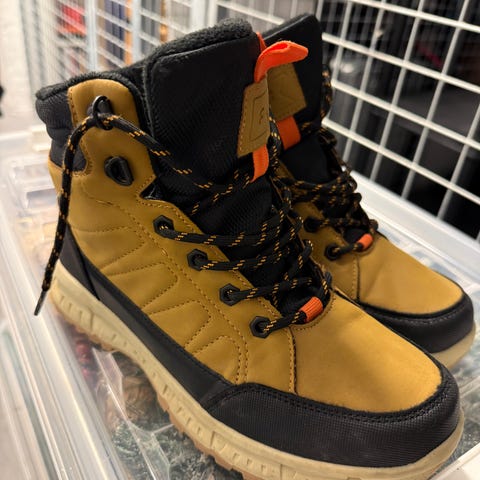 Barne sko i størrelse 32, brun farge, med snøring og foret innside. Skoene er designet for gutter og egner seg til utendørs bruk med solid materiale og god støtte.