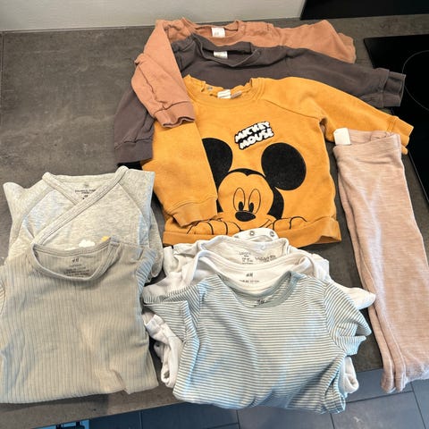 Barneklær for gutt i størrelse 80 med flerfarget design. Inneholder ulike plagg som bodyer, bukser, gensere, strømper og sokker, laget i bomull, over 40 ålagg pluss sokker