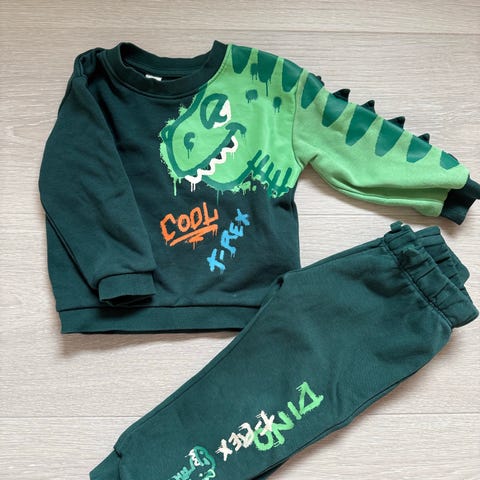Name it genser og Zara bukse i størrelse 104 for gutt. Genseren er grønn med dinosaurtrykk og har en ribbestrikket kant ved ermer og hals. Buksen er grønn i cordfløyel m bomullslag inni med elastisk midje for bedre passform. Nesten ikke brukt