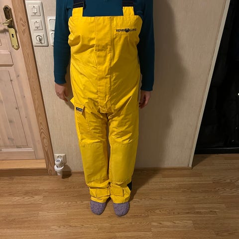 Klassisk regnjakke fra Tretorn selges i fargen gul. Jakken har to forlommer med klaff som holder fukt ute, og med både glidelås og knapper foran. Jakken, som er helt vanntett, er produsert av PVC-fri PU med varmesveisede sømmer. Pent brukt i 2 år, jakken kunne trengt en vask og selges derfor rimelig.