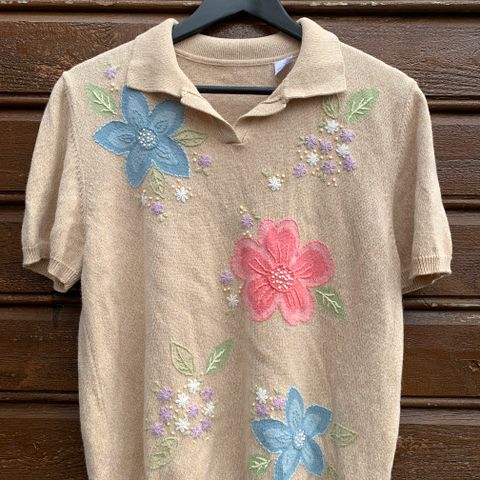 Den har glidelås i kraven. Bomull og polyester. Merke Konwall.