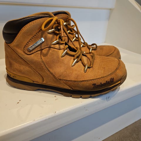 Timberland støvletter str. 42,5. Forholdsvis i ok stand, men har en rift i skinnet fremme på høyre støvel. Det er også noen svarte merker på tungen, skolissene og et par andre steder. Slitasje i øvre kant på hver støvel. Sålen ser ikke slitt ut. Trenger nubuck skopleie. Se bilder. Selges for kr 100, + porto (PostNord billigste sendemåte kr 69)