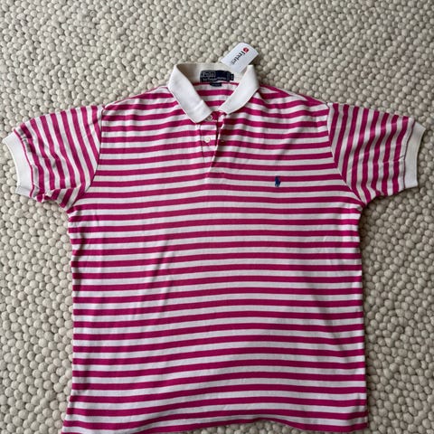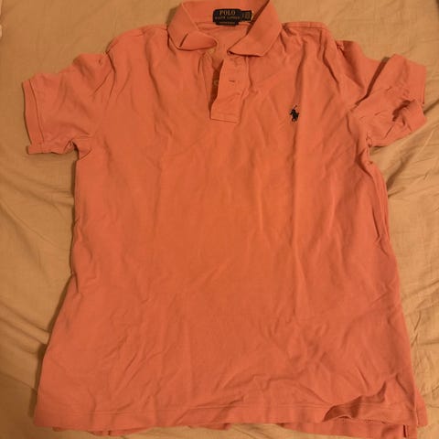 Ralph Lauren Polo T-skjorte i størrelse M for menn. T-skjorten er rosa og laget av mykt materiale. Den har klassisk polokrage og er dekorert med Ralph Laurens logo på brystet.