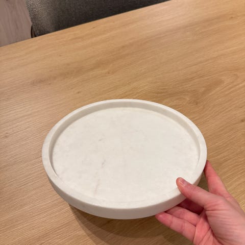 2 hvite marmorfat, dia 24 cm, høyde 1,5 cm. Fatene er nye/ubrukte. Selges halv pris.