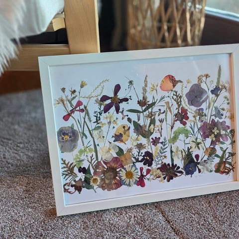 Originalt bilde laget av ekte, håndpressede blomster i størrelse 30x40 cm. Jeg har KUN én original, og nå selger jeg det🤩. Det er håndlaget og fylt med mange vakre blomster, gress og blader som gir et eventyrlig uttrykk 🤗