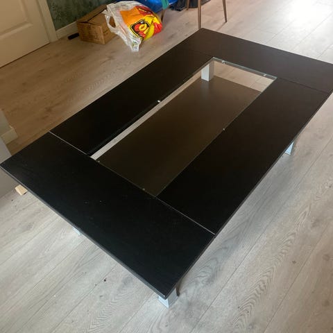 Salongbord med glassplate. De siste 4 årene folie over glassplaten. Folien kan fjernes.