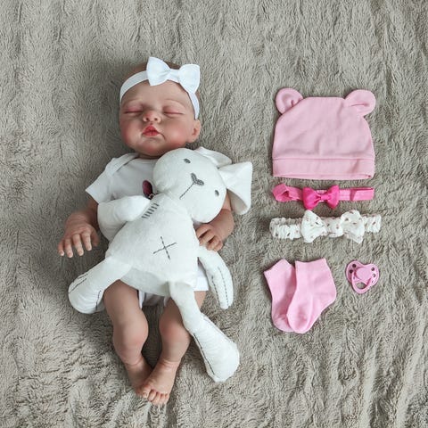 This doll weights is 3,kg and 55cm tall with high quality mohair- baby blonde hair(micro rooting). The doll has a newborn skin tone and finished with a textured effect for realism, but not too rough, which comes with a matte finish on top, milk bumps, capillaries and lots newborn detail. The doll is very flexible, she has to hold her head up, and she is very good at placing it in different sleeping positions/fabric body sew by me, filled with glass and plastic granules . She only uses a magnetic pacifier. This doll smells like a baby with its intended scent.