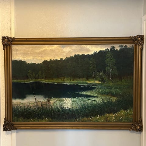Vakkert og stemningsfullt oljemaleri i varme høstfarger. Solid og dekorativ gullramme som gjør bildet til et blikkfang i rommet. I veldig pen stand.