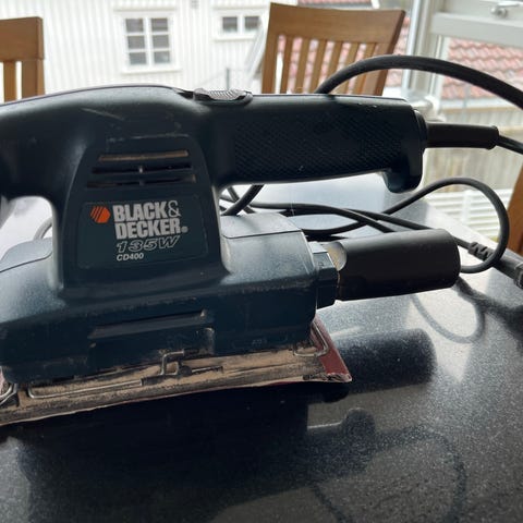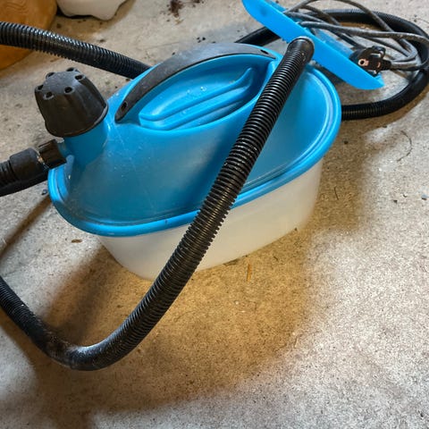 Black & Decker tepetfjerner. Enheten har stor tank til vann og en lang svart slange koblet til en rektangulær damp-plate som varmer opp tapeten og gjør den lett å skrape av.